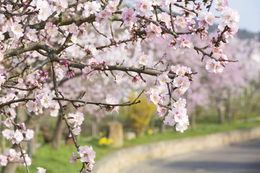Die Neubergstraße in Gimmeldingen mit blühenden Mandelbäumen